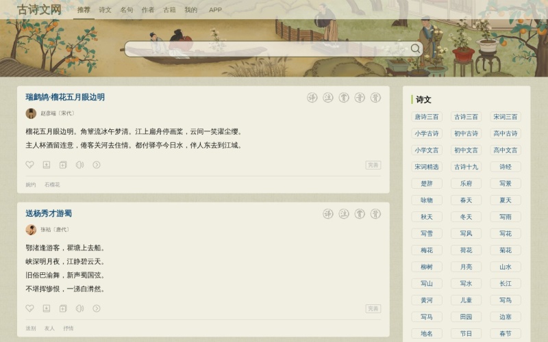 分类清晰,检索便捷:网站设计了细致的分类系统,用户可按朝代、作者、题材(如写景、咏物、抒情)、节日等进行筛选,同时也支持关键词搜索,方便快速定位目标内容。