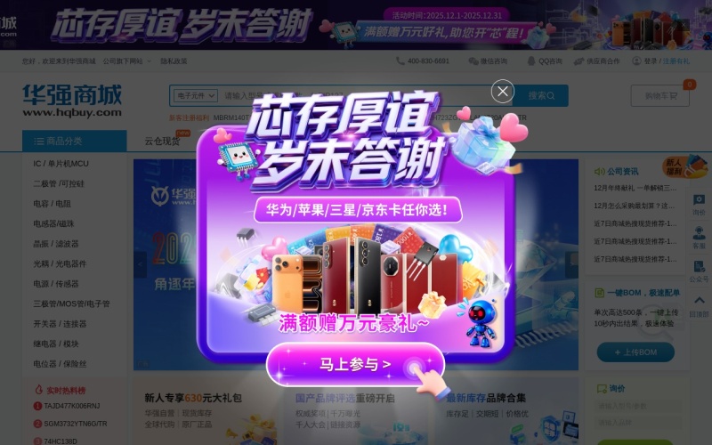 华强商城是深圳华强电子网集团股份有限公司旗下的一站式电子元器件采购平台,依托集团在电子元器件行业20多年的累积,充分发挥集团在系统、货源渠道、数据、仓储物流等方面的优势,为客户提供现货采购、海外代购、BOM配单及PCB制板服务。华强商城及线下团队为超过30000家终端客户提供元器件样品及批量采购服务,成为包括比亚迪、中兴通讯、英业达、伟创力、广达、研华、小米、海尔、歌尔声学、爱默生、VENTURE、SCANFIL等知名企业线上首选电子元器件小批量现货采购平台。