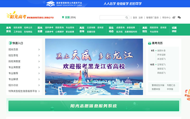 阳光高考由教育部学生服务与素质发展中心主办,教育部高校招生阳光工程指定平台,发布高校招生章程,提供学生名单公示、院校信息、分数线、填报志愿、选专业、高考咨询等服务。